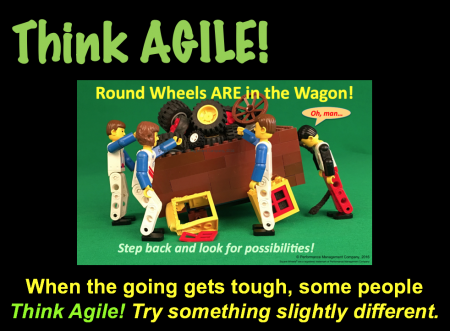 Agile Thinking and implementation are not about cutting costs or hiring some outsider to share perspective on what you should be doing differently. In my mind, the Round Wheels are already in the wagon and it is all about seeking to actively involve other people in the workplace to share and then implement new ideas.